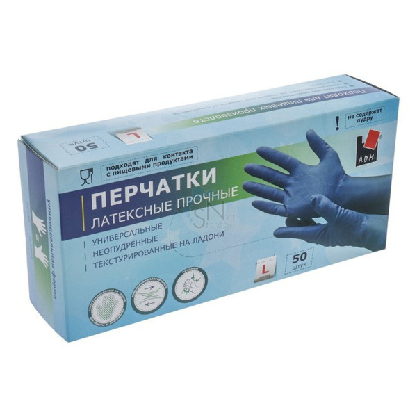 Перчатки латексные 25 пар (50 шт) размер L неопудренные прочные А.Д.М. 14262